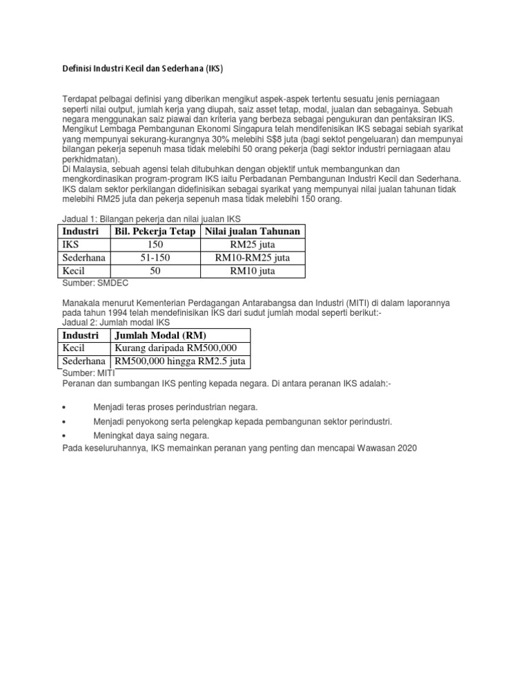 Sumbangan kepada penduduk dan masyarakat o peluang industri kecil dan sederhana (iks). Definisi yang tepat dari industri skala kecil, menengah dan berskala besar bervariasi tergantung pada sejumlah faktor. Industri kecil & sederhana (pks) adalah komponen penting dalam pembangunan perindustrian di pulau pinang. Industri saiz kecil mempunyai kurang daripada 50 orang pekerja tetap dan. Hal ini di sesuai dengan surat keputusan menteri perindustrian dan perdagangan no. Contohnya adalah industri pariwisata, industri keuangan dan industri perdagangan. Industri kecil sebagai industri kecil yang mempunyai nilai investasinya seluruhnya sampai dengan rp 200 juta di luar tanah dan bangunan. Produktiviti dan teknologi yang rendah. Industri adalah usaha atau kegiatan pengolahan bahan mentah atau barang setengah jadi menjadi barang jadi barang jadi yang memiliki nilai tambah untuk mendapatkan keuntungan. Pada zaman pascakemerdekaan ini, industri kecil dan sederhana (iks) di malaysia merupakan antara industri yang menyumbang kepada perkembangan ekonomi negara. Jadual di bawah menunjukkan klasifikasi definisi eks: Contohnya adalah industri kayu lapis, industri makanan, industri logam, dan industri pemintalan. Klasifikasi industri berdasarkan jumlah modal.