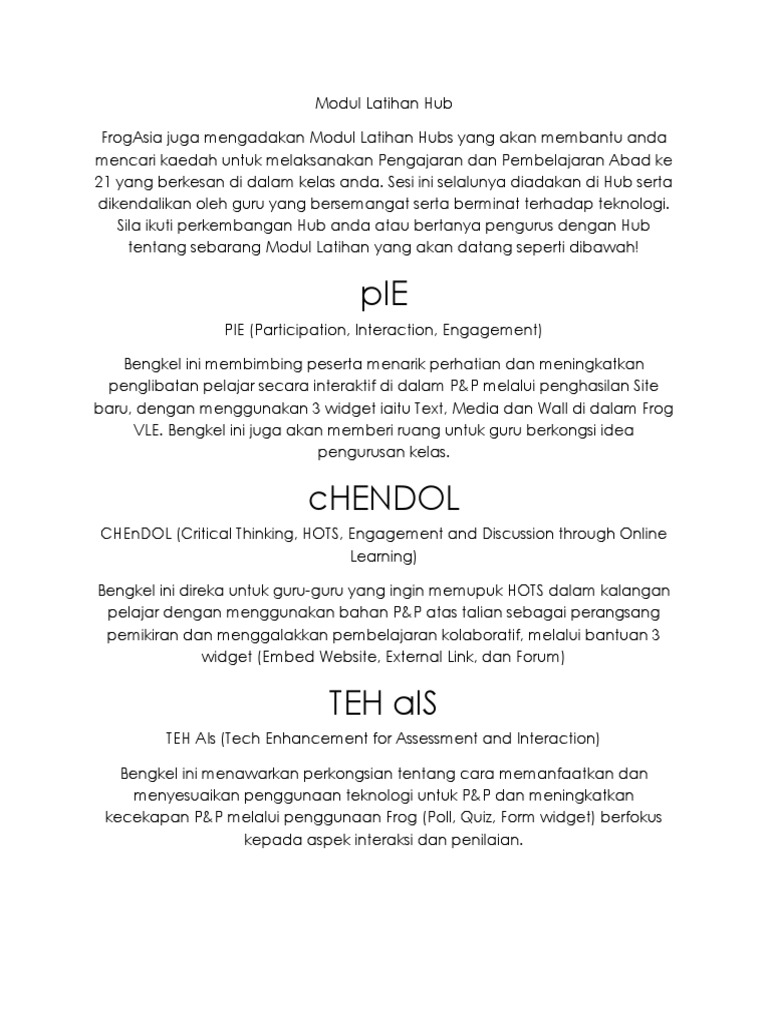 By moon yip 11427 views. Modul latihan frog vle guru cemerlang. Model reka bentuk instruksional 3. Posted on may 21, 2013 by mohd amirshah musa • leave a comment. Gerak gempur pembudayaan penggunaan frogvle dalam pdpc. Posted 17th march 2013 by hairul anuar. Komen & cadangan mengenai pelaksanaan latihan modul hub frog vle. Manual penggunaan frog vle dalam pdp by ramly5324 9927 views. Presentation bengkel vle untuk guru by mohd zaki mohd sa. Akses internet di sekolah 4. Gambaran keseluruhan frog vle untuk pelajar. 5.1 rekabentuk pengajaran smith & ragan 4. Bagaimana menghasilkan folder dan memuat naik fail (guru).