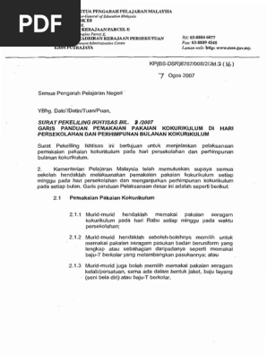 Surat Pekeliling Ikhtisas Kokurikulum - Rujuk surat pekeliling ikhtisas bilangan 1/1986, kp(bs)8591/jld.. kegiatan kokurikulum yang dilaksanakan di sekolah hendaklah bersifat merentas disiplin, bersepadu dan tidak bersifat eksklusif. Rujuk surat pekeliling ikhtisas bilangan 1/1986, kp(bs)8591/jld. Panduan tatacara pengurusan disiplin murid. Pihak kpm telah mengeluarkan surat pekeliling ikhtisas bilangan 2 2007 dalam menentukan waktu minimun bagi pelaksanaan kokurikulum di peringkat rendah dan menengah. 17/2000 bertarikh 16 november 2000).