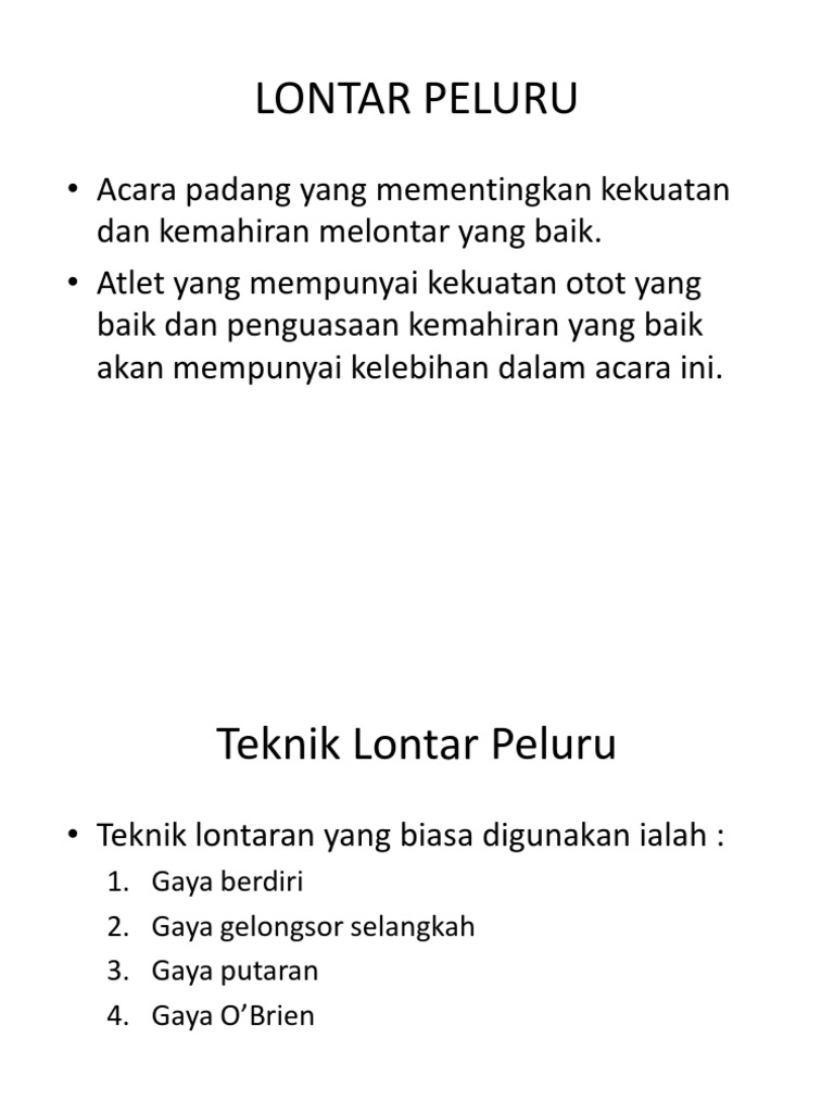 Lontar Peluru from imgv2-2-f.scribdassets.com Semua daya yang bertindak ke atas peluru mestilah berada dalam satu satah yang sama. Fasa pemulihan latihan ansur maju sepintas ialu, pada anggapan umum memang mudah melakukan lontaran, dan sesiapa sahaja boleh melakukan lontaran tanpa masalah. Latihan ansur maju gelongsoran dalam lontar peluru. Sudut penerbangan adalah bergantung kepada ketinggian seseorang pelontar. Dari sini, bermulalah sejarah baru bagi acara lontar peluru. Cara melakukan lontaran harus dipelajari oleh setiap peserta, manakala kemahiran dalam melakukannya juga hanya diperolehi menerusi latihan. Dalam melakukan lontaran, terdapat beberapa peringkat yang berlaku. Berhenti pada kedudukan ''power position''.